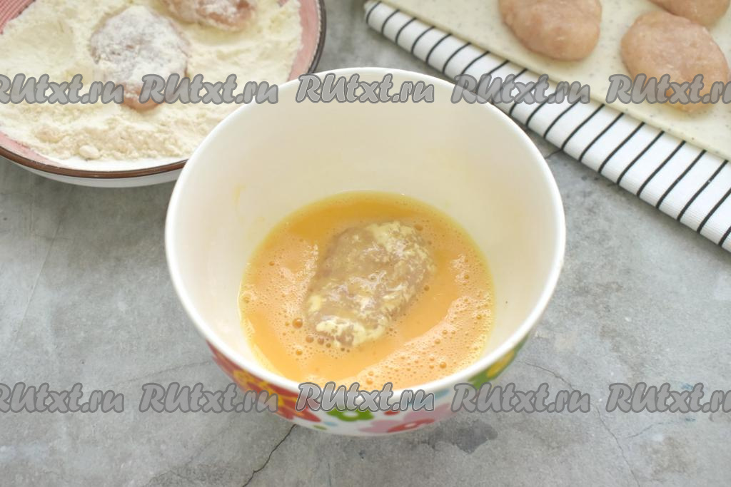 Затем куриные наггетсы из фарша с двух сторон окунаем в яичный кляр.