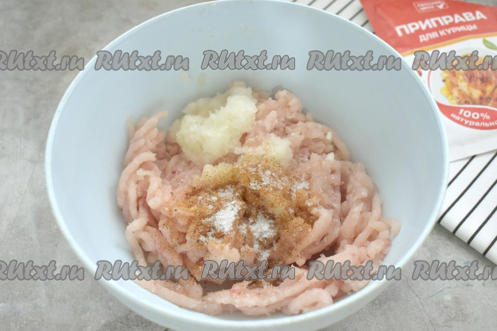 В миску с фаршем добавляем пропущенный через мясорубку (или натёртый на крупной тёрке) лук, солим, всыпаем специи по вкусу (в качестве специй я использовала приправу для курицы).