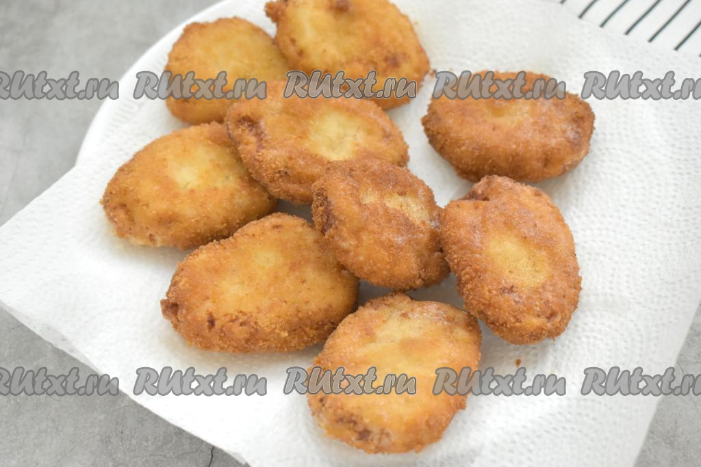 Жареные куриные наггетсы со сковороды перекладываем на бумажные полотенца, чтобы удалить излишки масла. Постепенно жарим все наггетсы. При необходимости в процессе жарки подливаем в сковороду масло.
