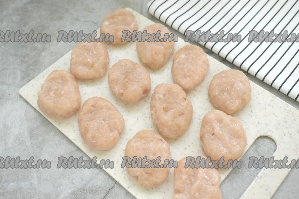 Тщательно перемешиваем получившийся куриный фарш. Делим фарш на 12 равных частей и формируем из них наггетсы.