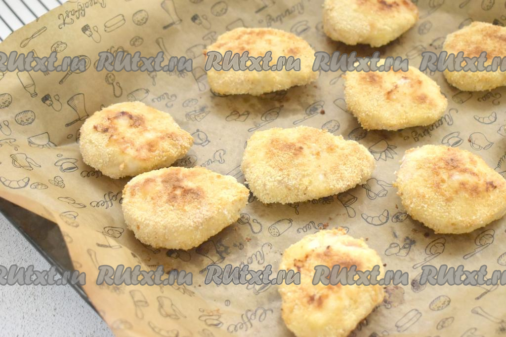 Затем переворачиваем наггетсы и готовим в духовке ещё 10 минут. В процессе запекания куриные наггетсы должны подрумяниться с двух сторон.
