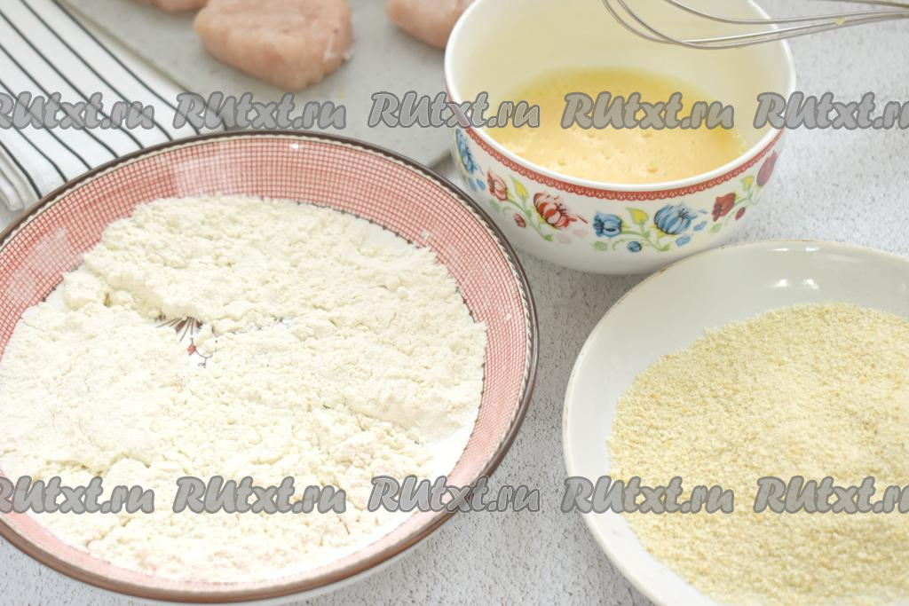 В небольшую миску разбиваем яйцо, взбиваем венчиком (или вилкой) до однородности. На одну тарелку насыпаем муку, а на вторую - панировочные сухари.
