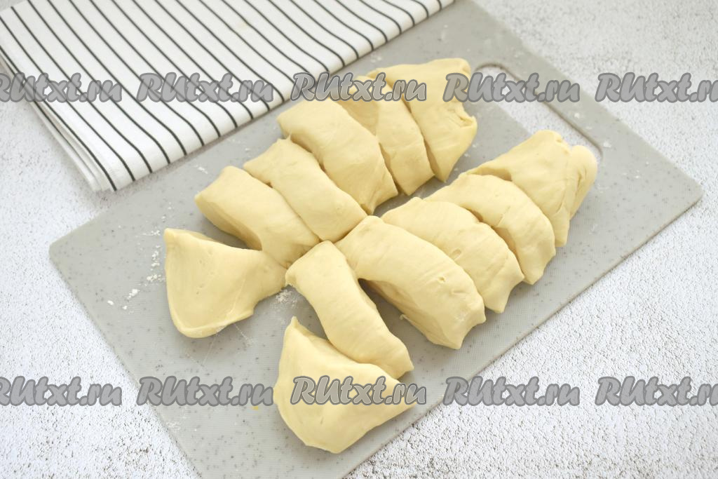 На слегка присыпанной мукой поверхности вначале одну часть теста раскатываем в тонкую лепёшку толщиной 2 миллиметра, ориентировочно диаметром 16 сантиметров. Края лепёшки я подравняла, приложив сверху тарелку диаметром 16 сантиметров и отрезав лишнее тесто.