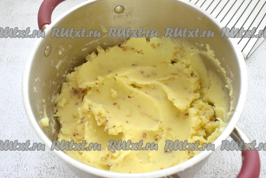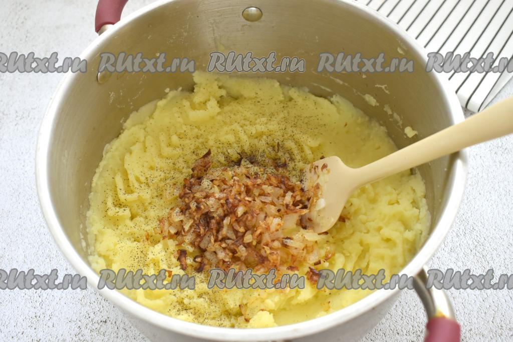 Толкушкой разминаем варёный картофель в однородное пюре, добавляя понемногу отвар, который мы оставляли. Вливая небольшими порциями отвар и вмешивая его, учитываем, что картофельное пюре должно быть в меру плотным. Как только добились нужной густоты пюре, значит не нужно больше добавлять отвар. В получившееся однородное картофельное пюре выкладываем лук, обжаренный до золотистости, перчим.