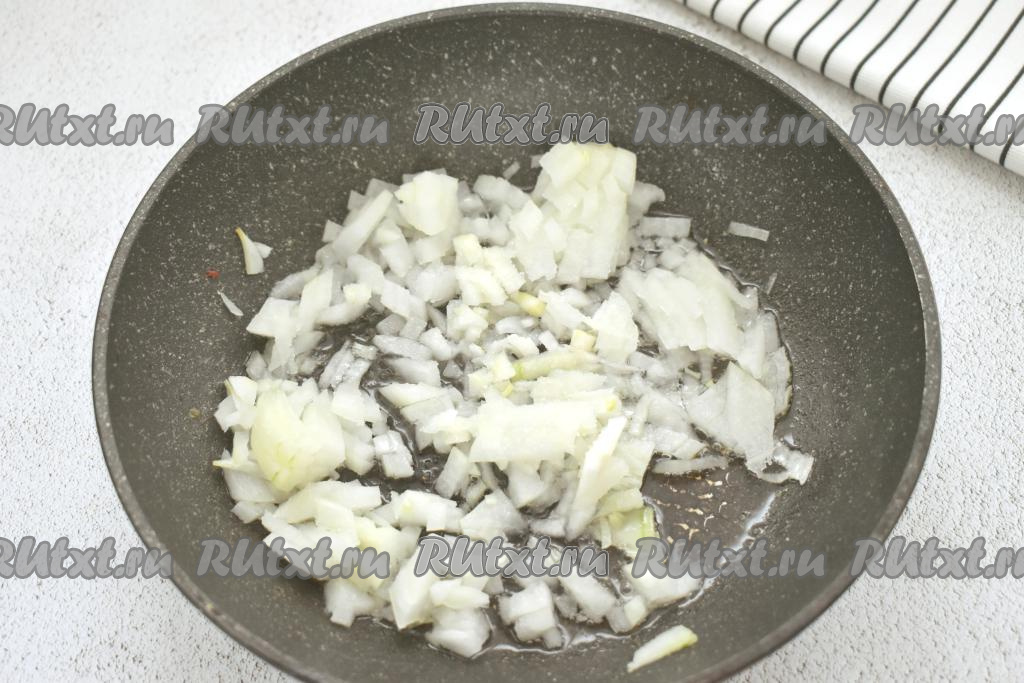 Очищаем лук, нарезаем его мелко и выкладываем в сковороду, в которой уже хорошо прогрелось растительное масло. Обжариваем лук на среднем огне до золотистости (примерно 4-5 минут), иногда помешивая.