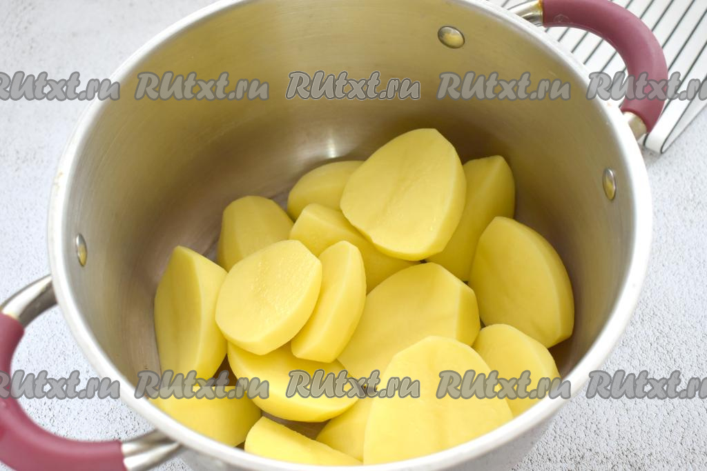 Вначале займёмся начинкой для кыстыбыя. Для этого очищенную картошку выкладываем в кастрюлю (я крупные картошины разрезала на несколько частей), заливаем полностью водой и ставим на сильный огонь. После закипания подсаливаем воду, уменьшаем огонь, отвариваем картофель до готовности (ориентировочно в течение 20-25 минут, готовые картошины будут легко прокалываться ножом). Убираем кастрюлю с готовой картошкой с огня. Сливаем из кастрюли в отдельную ёмкость примерно 100 миллилитров отвара, в котором варился картофель (этот отвар нам потребуется в дальнейшем). Оставшийся в кастрюле отвар выливаем (он нам не потребуется).