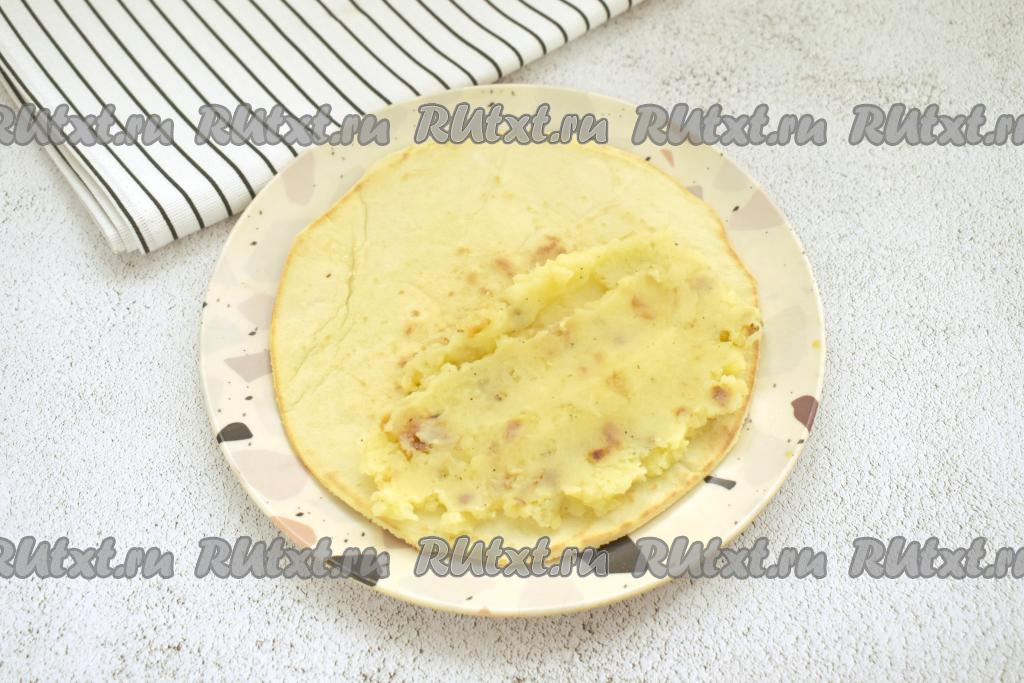 Готовую лепёшку перекладываем со сковороды на тарелку. На одну половину горячей лепёшки выкладываем 2 столовых ложек начинки из картошки, разравниваем.