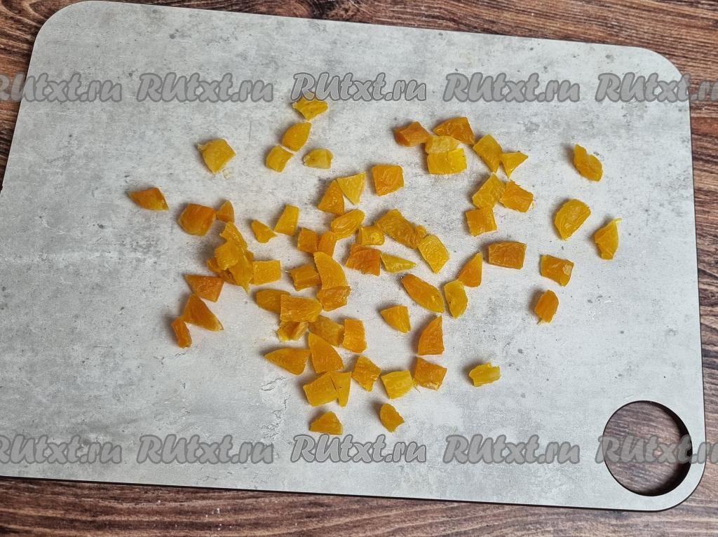 Обсохшую курагу нарезать на части, которые примерно должны быть равны размеру изюма.