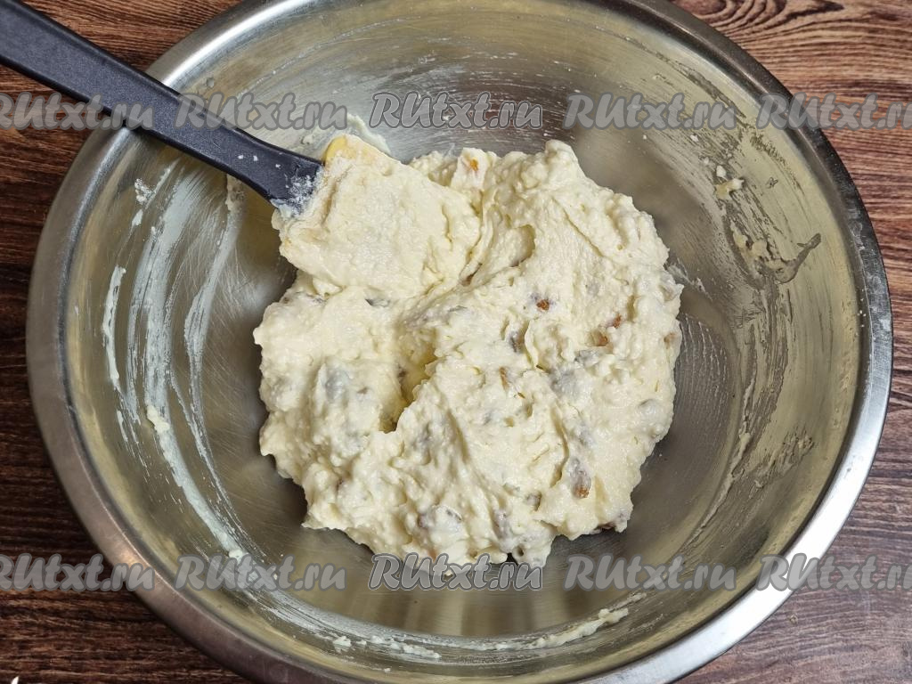 Всыпать в творожную массу обсохший изюм и кусочки кураги.