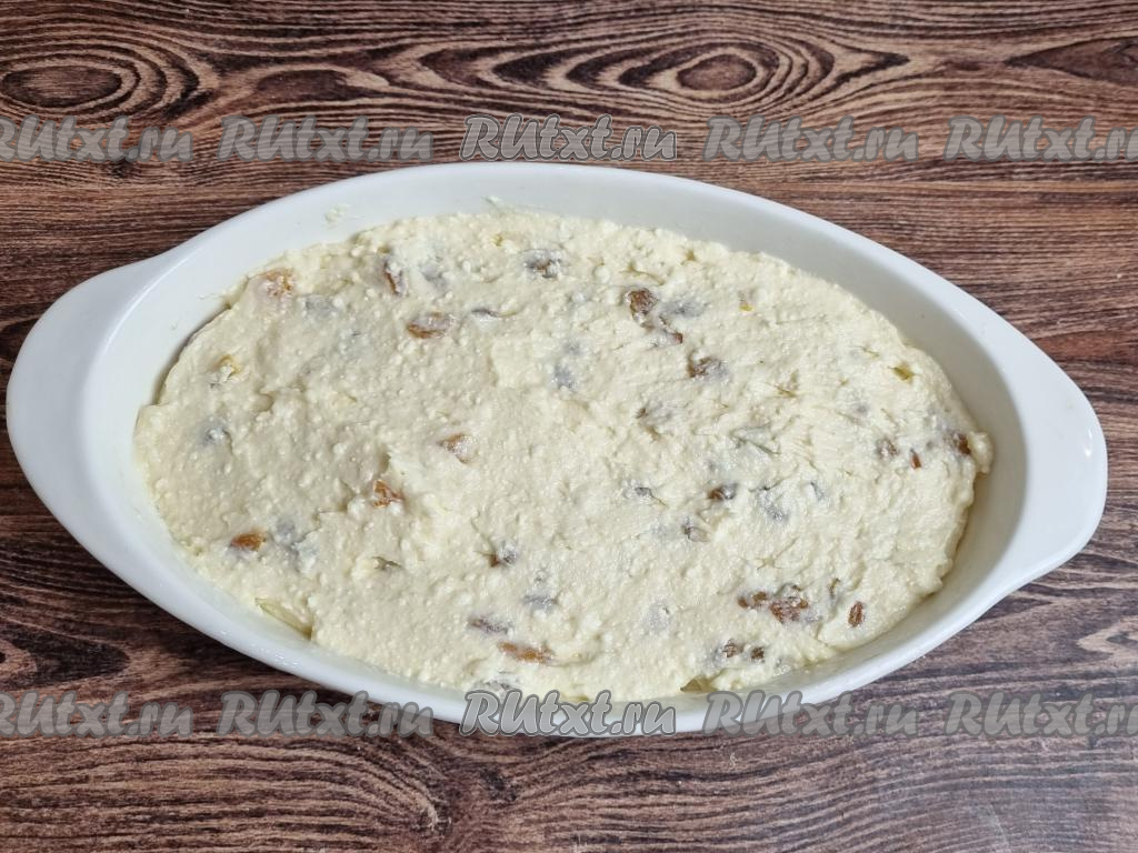 Творожную запеканку с курагой и изюмом выпекать в разогретой до 180 градусов духовке в течение 30-35 минут (до подрумянивания сверху).
