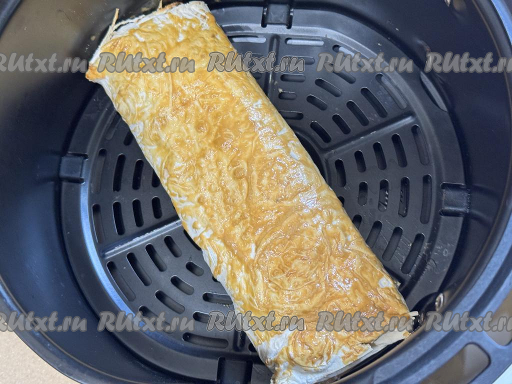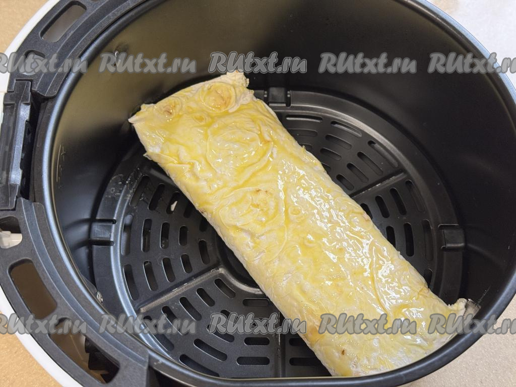 Рулет из лаваша целиком не поместится в чашу аэрогриля, поэтому его и нужно разрезать на 2 части.
