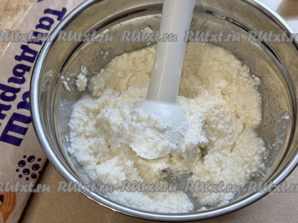 Пробить творог с сахаром и белком погружным блендером до однородности, после этого творожная начинка будет готова.