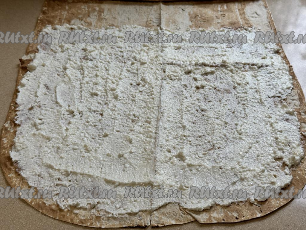 Отступая от краёв лаваша по 1 сантиметру, нанести творожную начинку на лист лаваша ровным слоем.