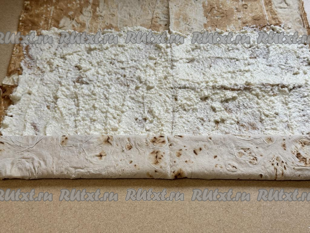 Свернуть лаваш с творогом в плоский рулет, начиная с более узкой стороны.