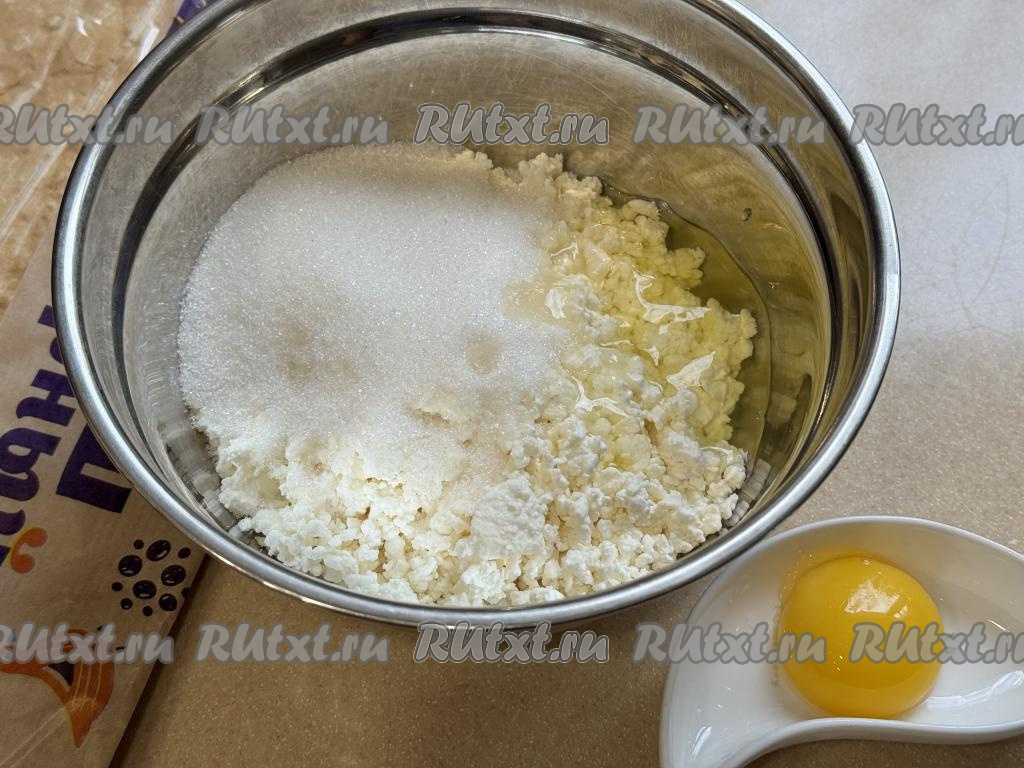 Яйцо аккуратно разделить на белок и желток. Для получения начинки нужно в миске соединить творог, сахар и яичный белок (желток нам понадобится для смазывания рулета).