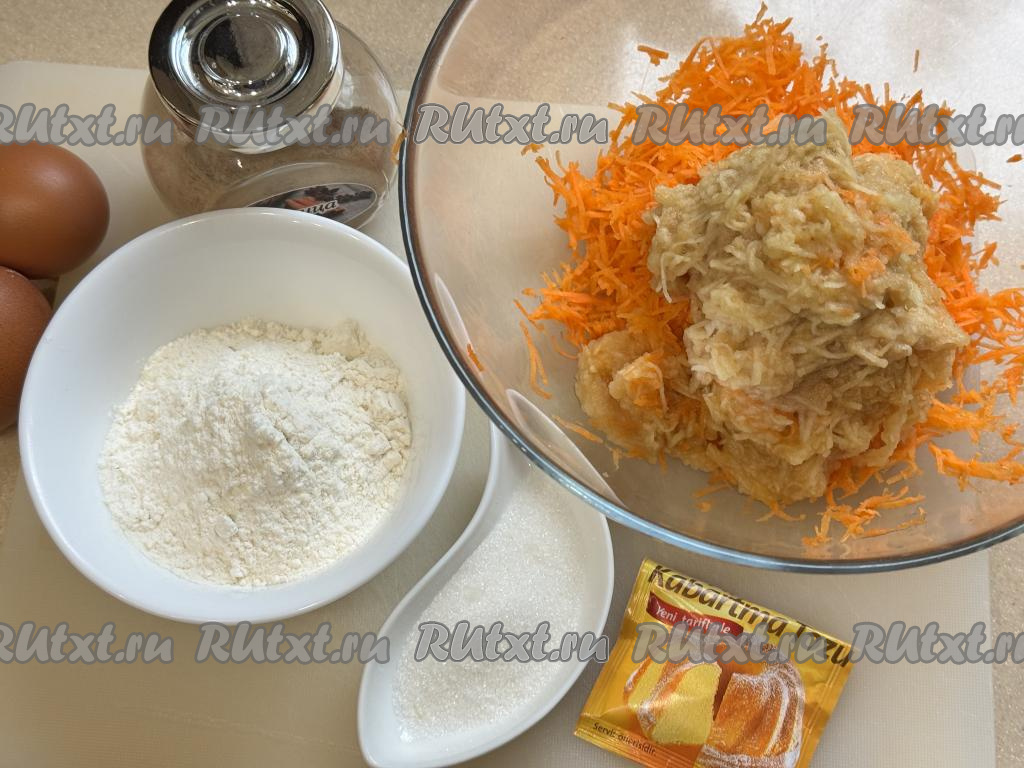 Морковь натереть на мелкой тёрке в глубокую миску. Яблоко очистить от кожуры и тоже натереть на мелкой тёрке, не затрагивая семенную коробку. Натёртое яблоко добавить в миску с морковью. Для вафель понадобится 150 грамм натёртой морковки и 100 грамм натёртых яблок.