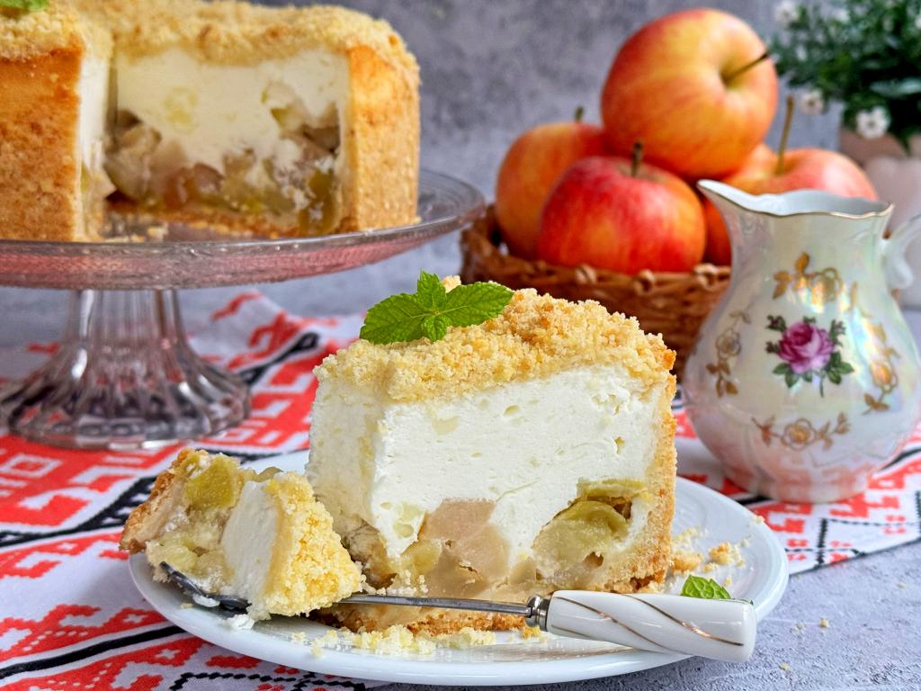 А вот как аппетитно выглядит этот наивкуснейший пирог в разрезе. Нежнейшее сметанное суфле и кусочки яблок отлично сочетаются с песочной основой пирога!