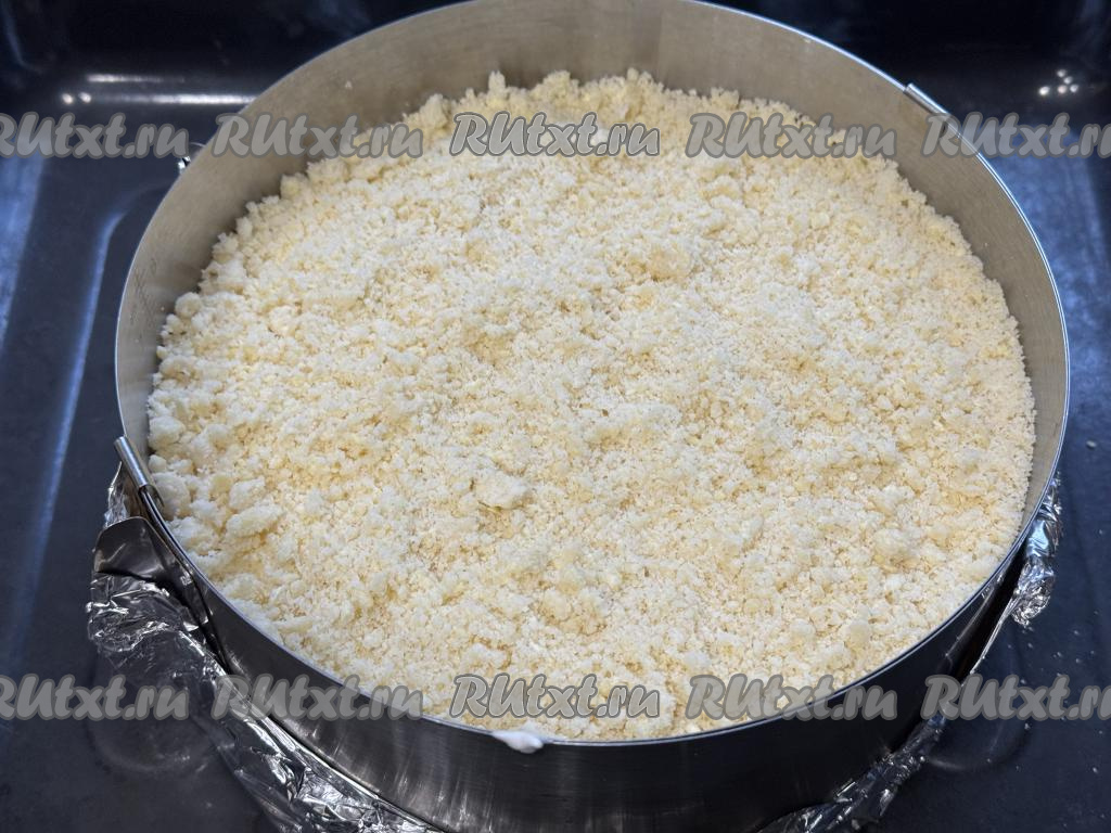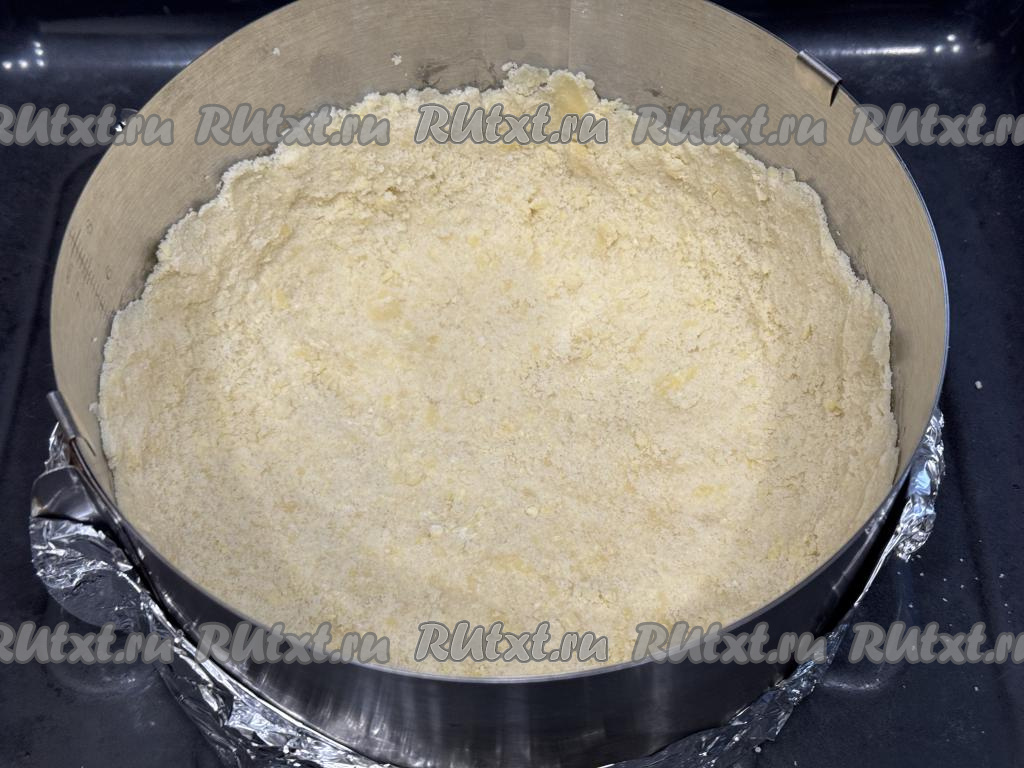 Я в качестве формы для выпечки использовала разъёмное кулинарное кольцо диаметром 20 сантиметров, дно сформировала из пергамента и фольги, сложенной в два слоя. Затем получившуюся форму для выпечки поставила на противень и только после этого выложила большую часть песочной крошки и утрамбовала.
