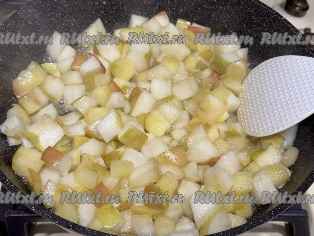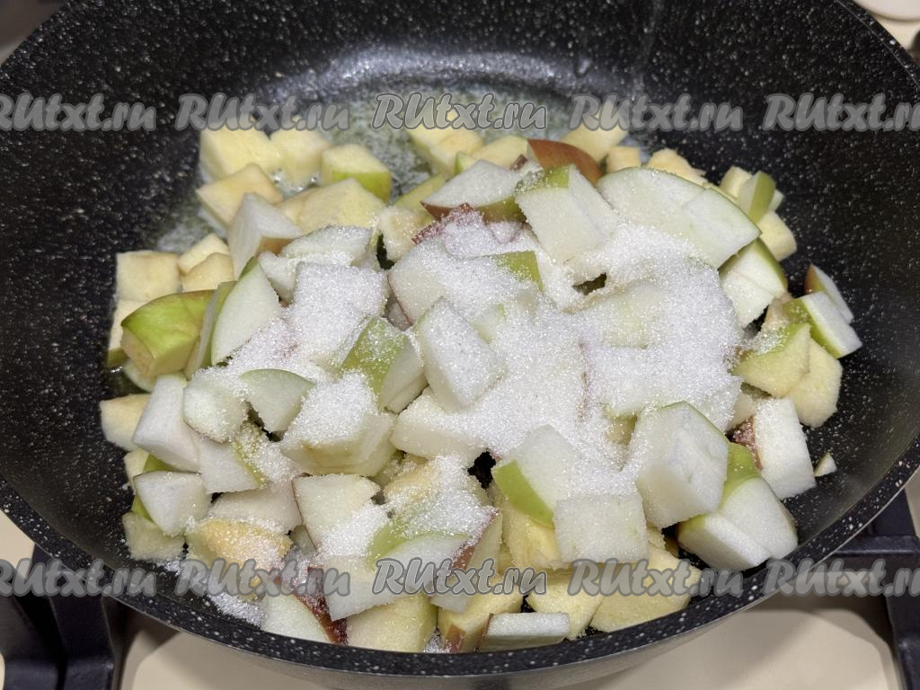 Томить яблоки минут 10 (яблочки должны стать мягкими, но при этом сохранить форму), периодически перемешивая. Снять сковороду с огня, дать яблочной начинке остыть.