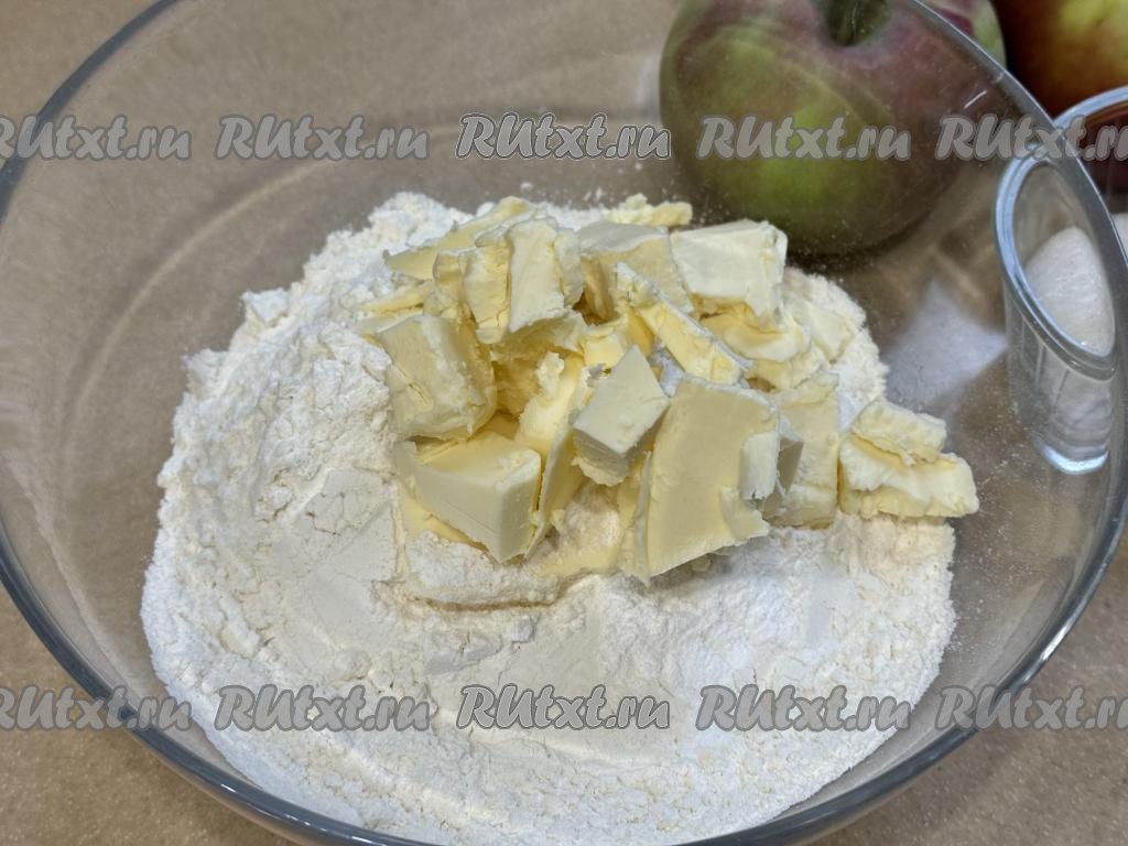 Сливочное масло достать из холодильника, нарезать на небольшие кусочки, добавить в миску с сухими ингредиентами.