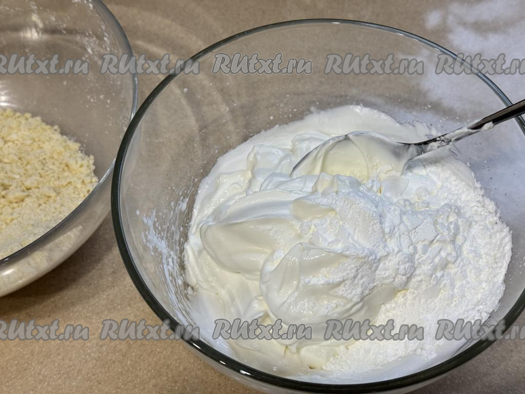 Столовой ложкой во взбитые белки аккуратно вмешать сметану и крахмал, стараясь не сбить воздушность белков. Сметанное суфле должно получиться очень воздушным, однородным.