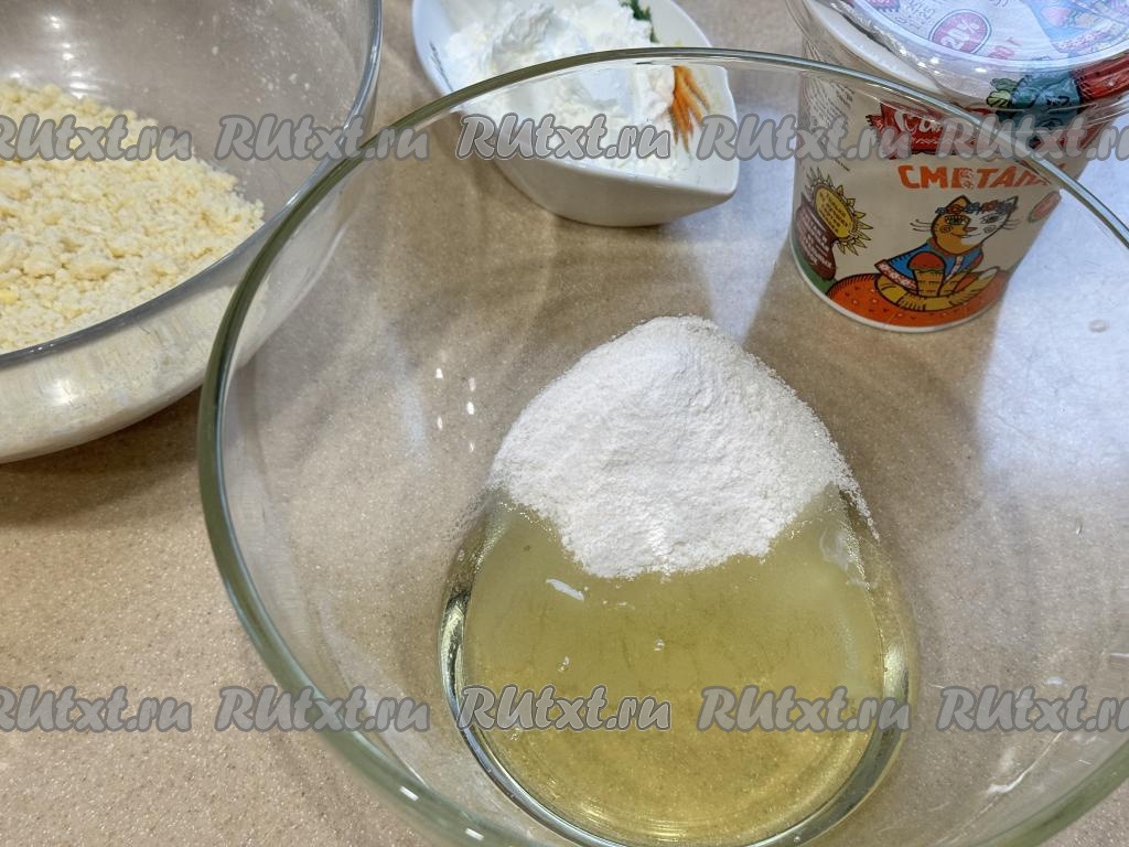 Во взбитые белки добавить сметану, ванильный сахар и крахмал.