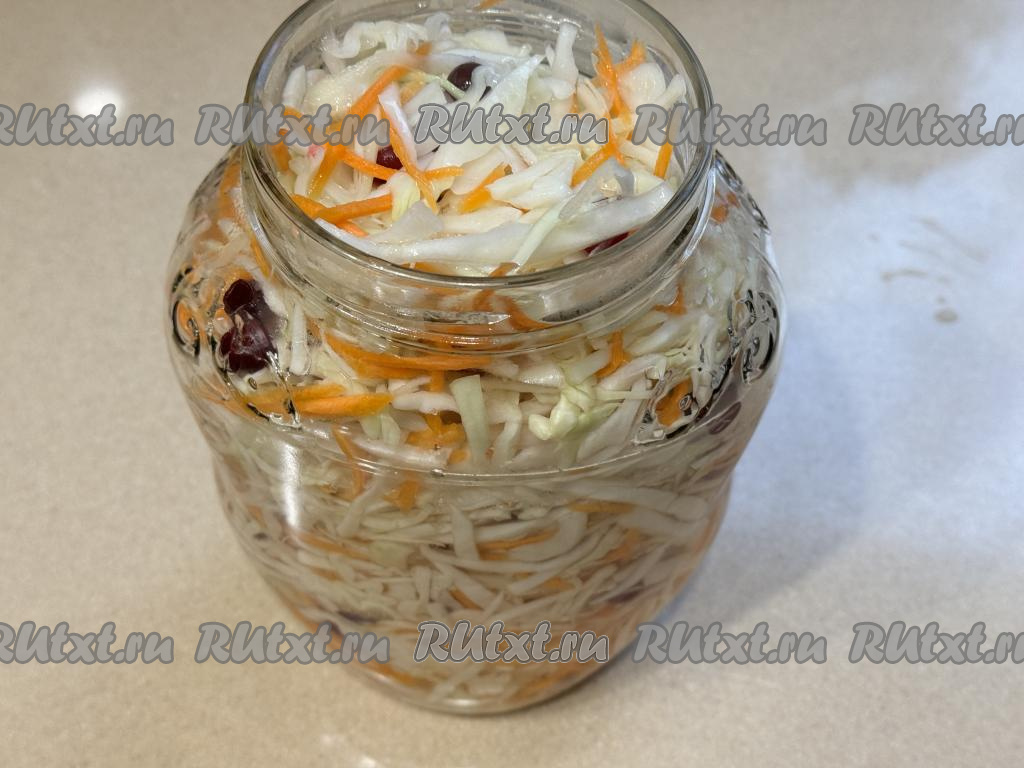 Капусту с морковью и клюквой выложить в банку (я взяла банку объёмом 2 литра), влить очень горячий маринад. Оставить банку на кухонном столе до полного остывания.