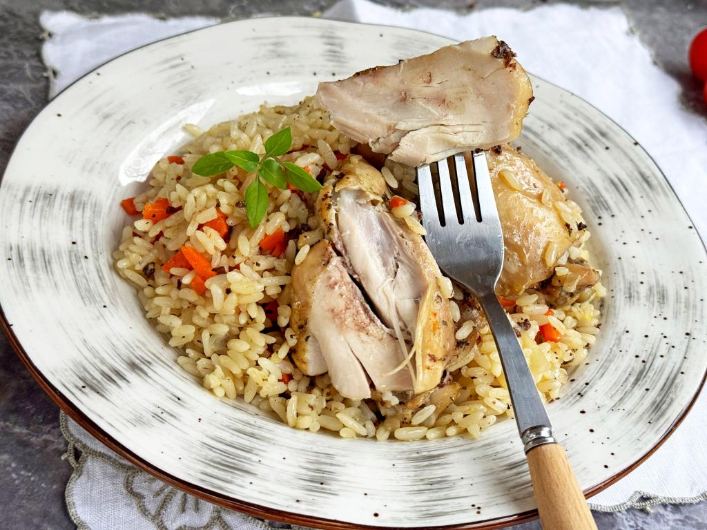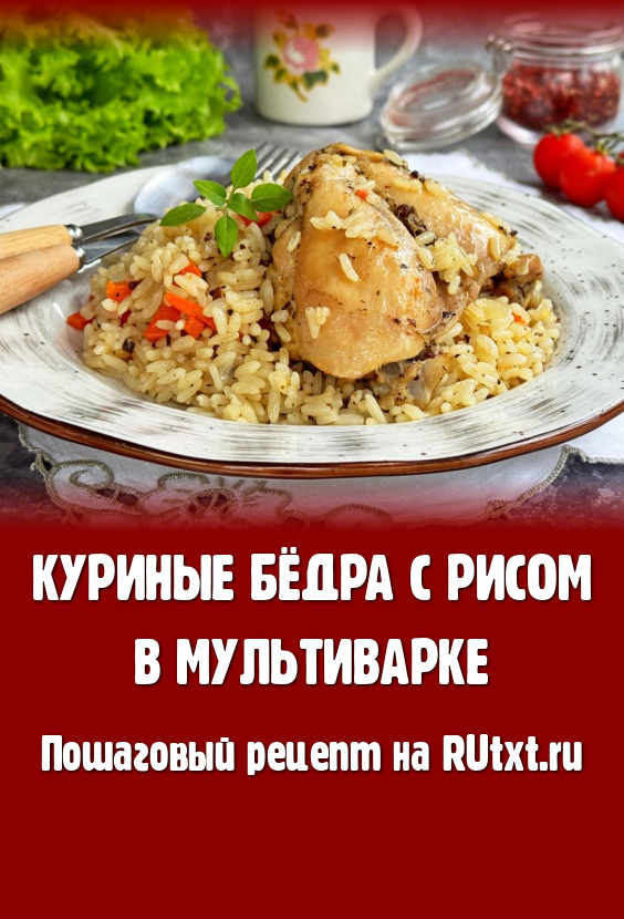 Перемешать рассыпчатый рис с нежными, сочными куриными бёдрами, разложить из чаши мультиварки по тарелкам и в горячем виде подать к столу.