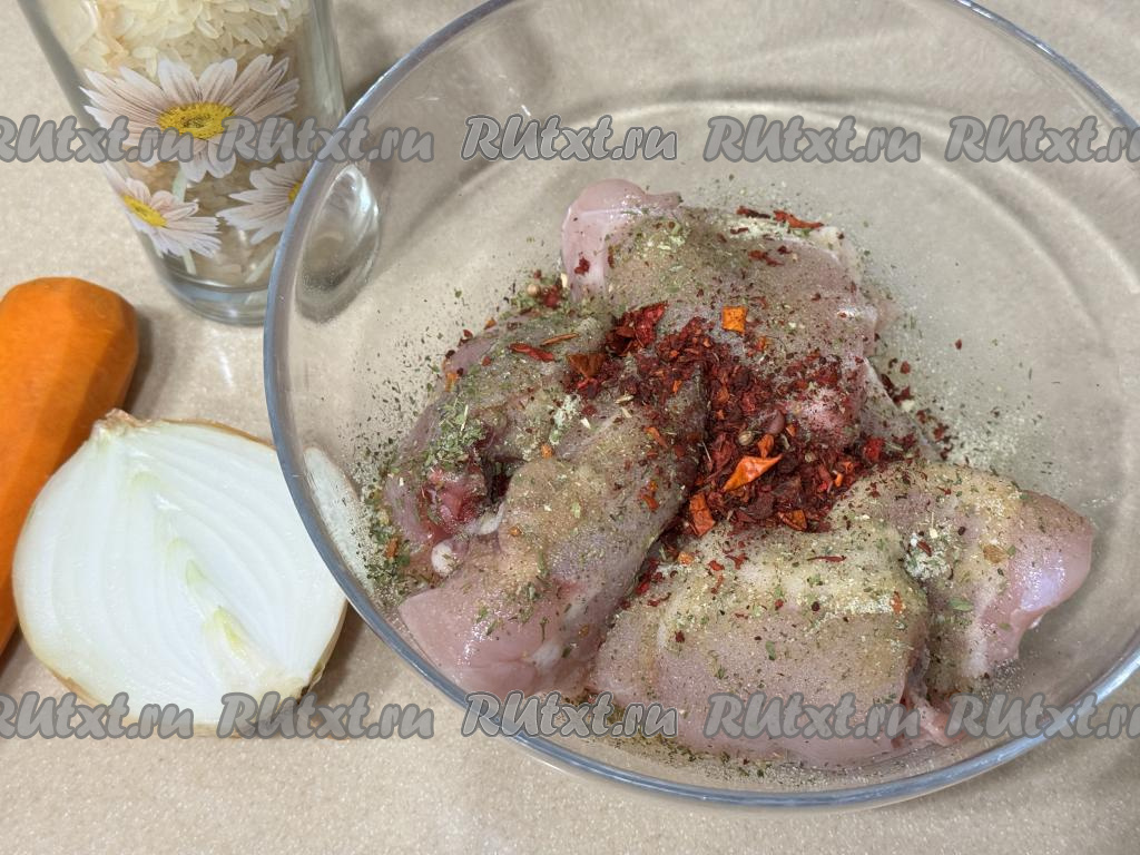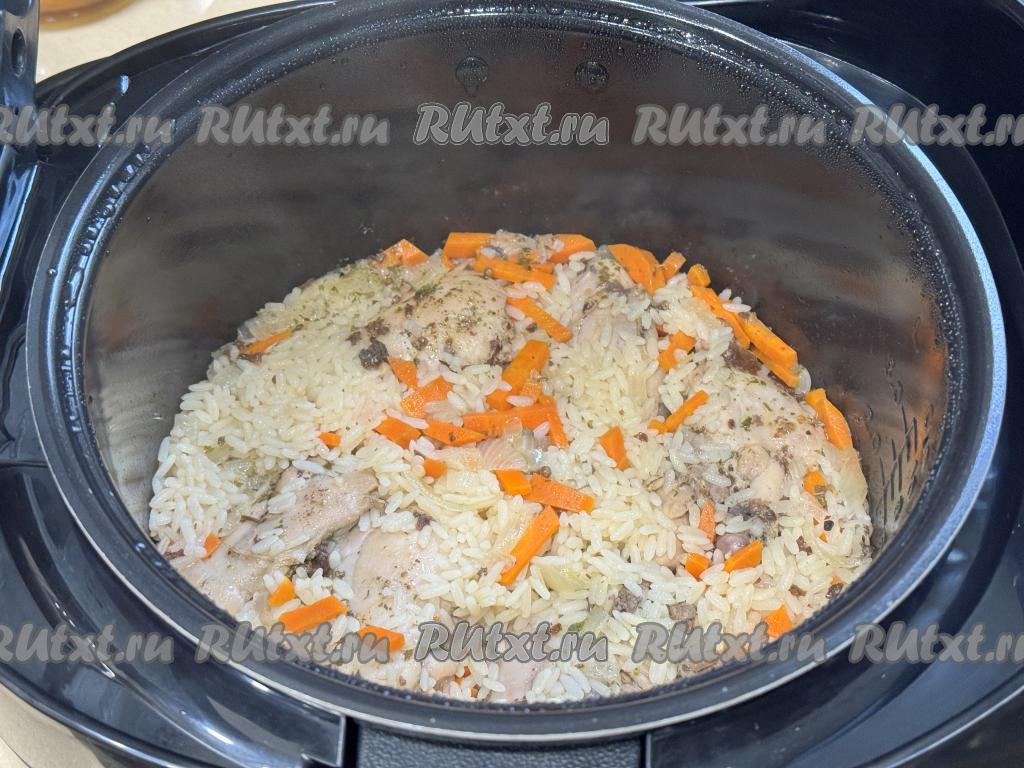 Влить воду комнатной температуры, перемешать куриные бёдра с рисом. Выставить режим "Плов" на 40 минут, крышку мультиварки закрыть.