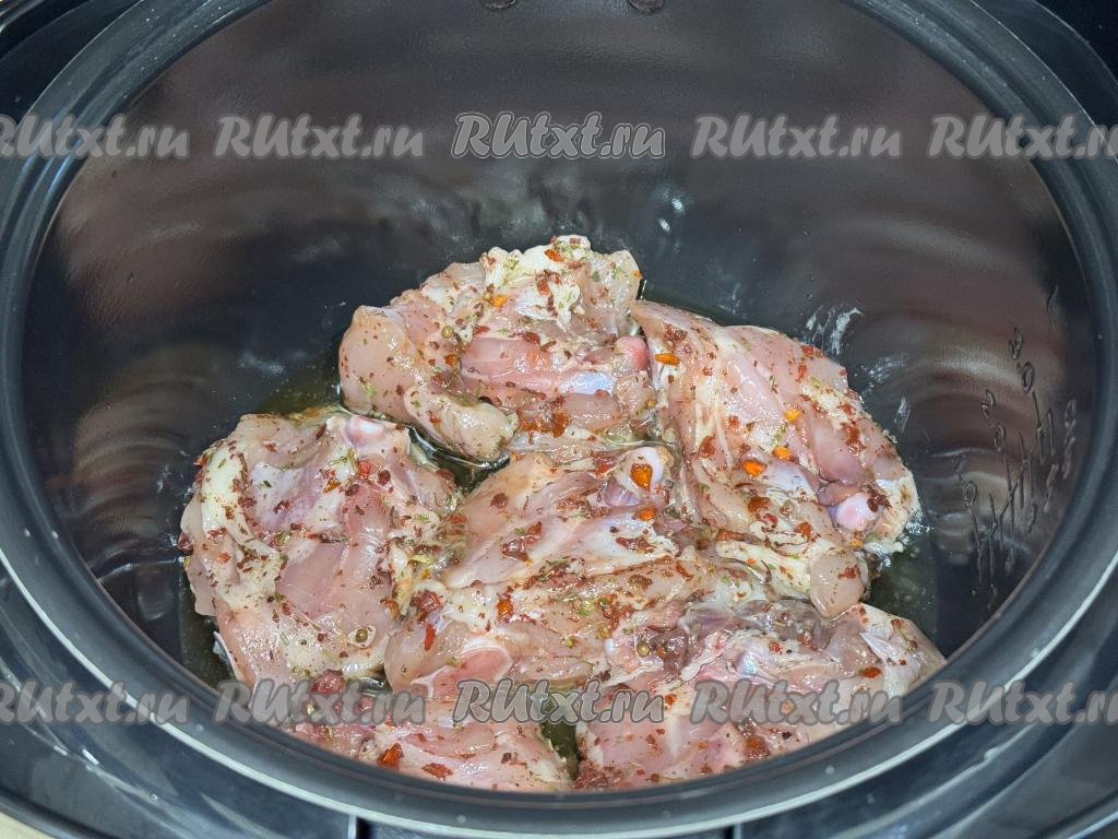 Влить в чашу мультиварки растительное масло, выставить режим "Жарка" на 20 минут, выложить куриные бёдра.