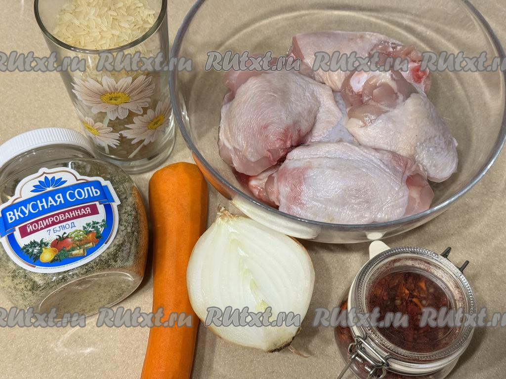Подготовить продукты. Лук и морковь почистить. Куриные бёдра вымыть. Рис (у меня - пропаренный) тщательно промыть под проточной водой, лишней воде дать стечь.