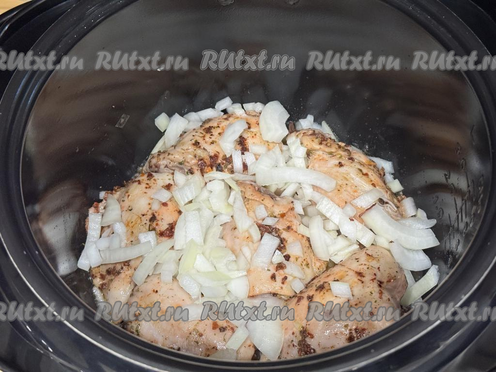 Обжарить бёдрышки, не закрывая крышку мультиварки, с двух сторон в течение 10 минут. Затем добавить мелко нарезанный лук, обжаривать 5 минут, периодически перемешивая.