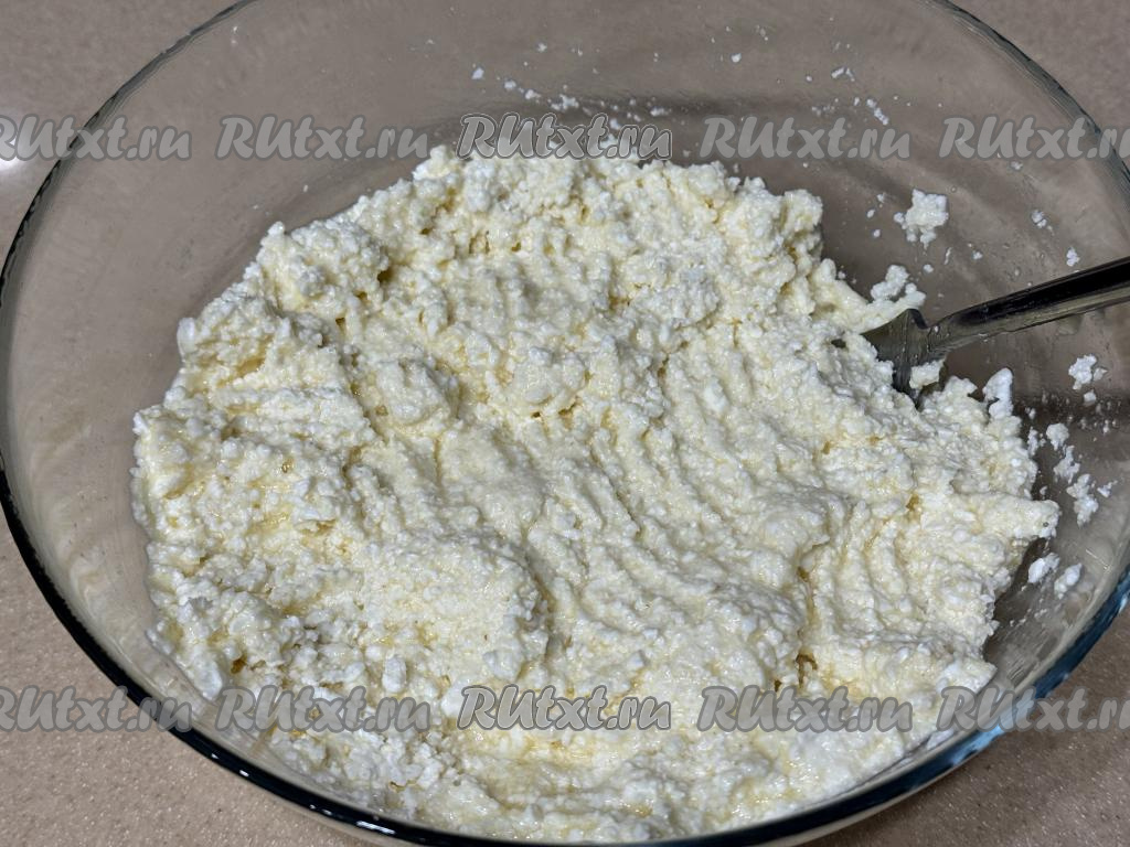 Перемешать творожную массу столовой ложкой до однородности, она должна получиться густой и вязкой, как на фото. Если творожная масса получилась жидковатой (многое зависит от влажности творога и от величины яиц), тогда добавьте ещё 0,5-1 столовую ложку манки, добиваясь нужной густоты творожно-манного теста. Оставить тесто на 30 минут, чтобы манка набухла.