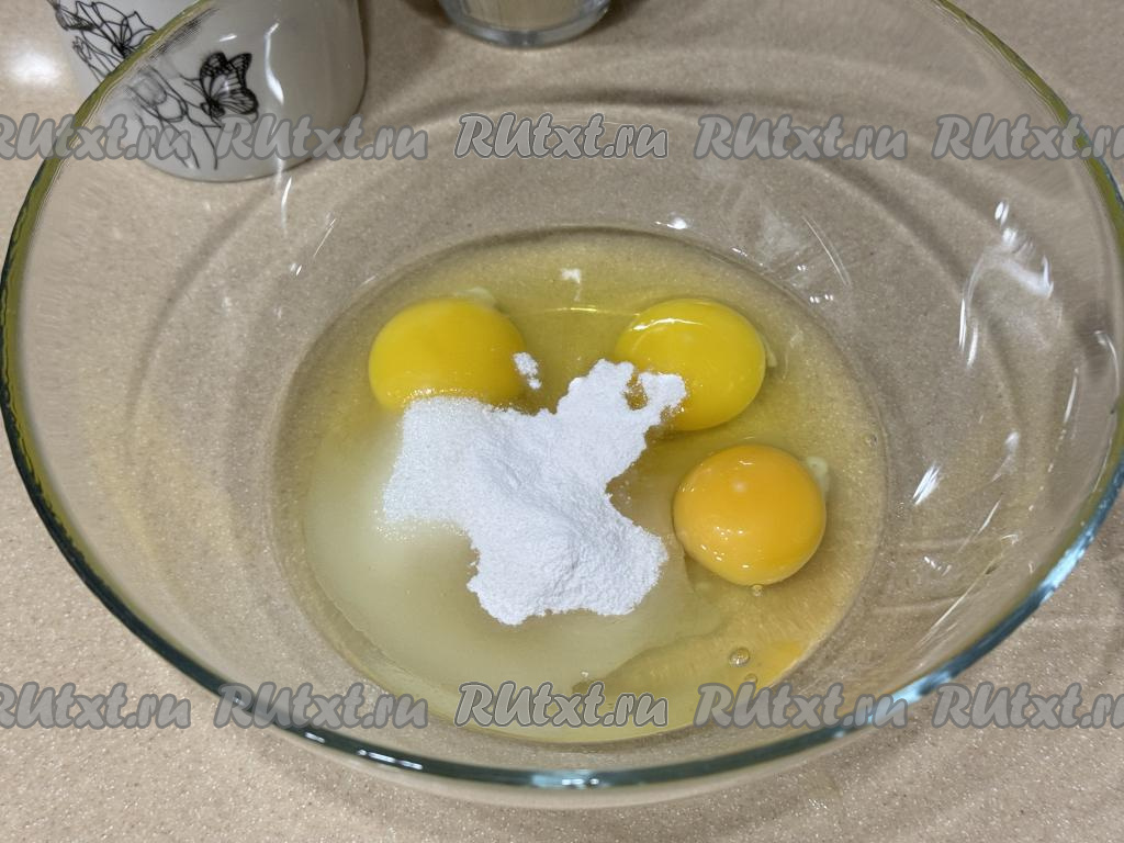 В миске соединить яйца, сахар, соль и ванильный сахар, перемешать яичную массу венчиком в течение 2-3 минут (масса должна немного посветлеть и увеличиться в объёме в процессе взбивания).
