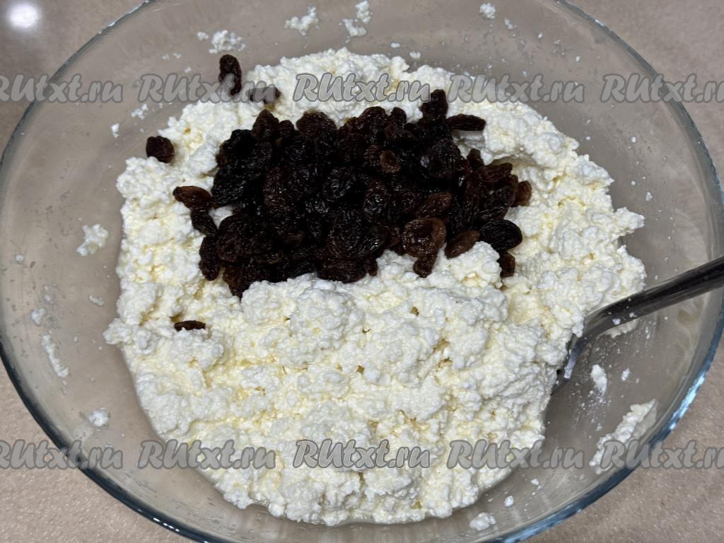 После того как творожно-манное тесто постоит 30 минут, добавить в него изюм, перемешать.