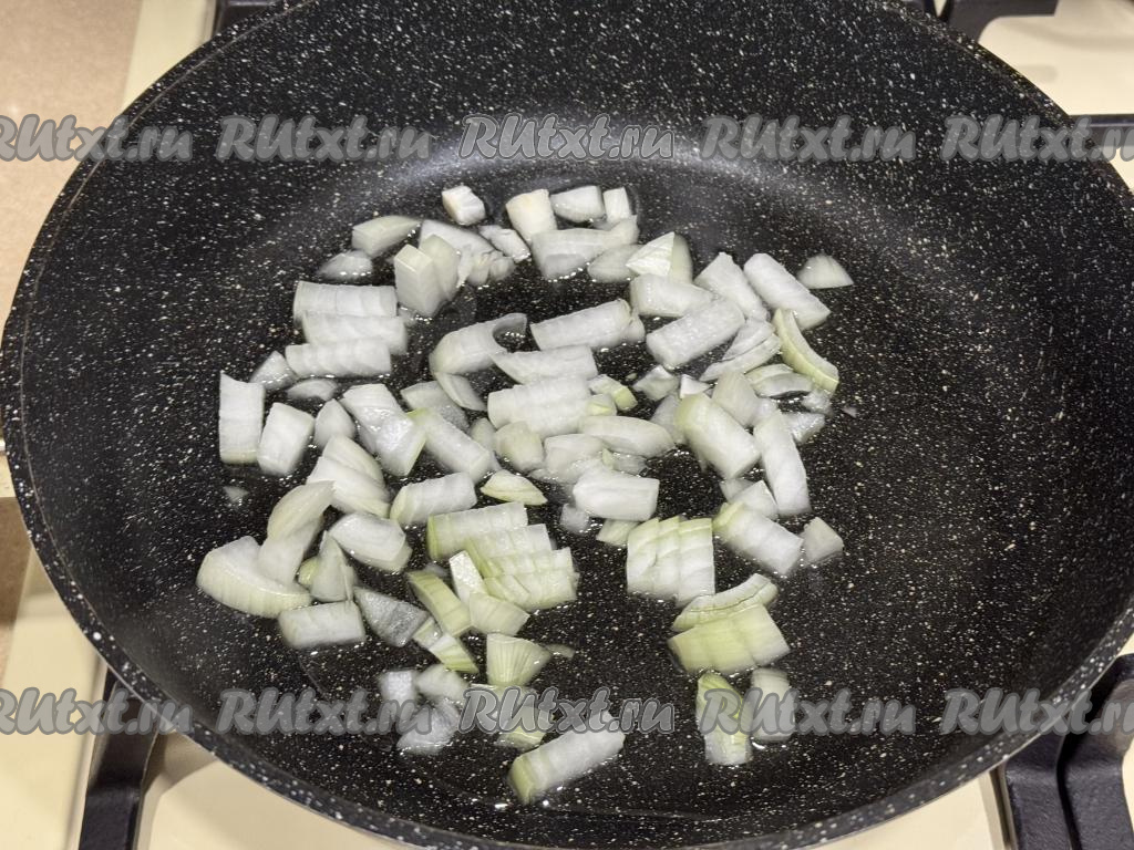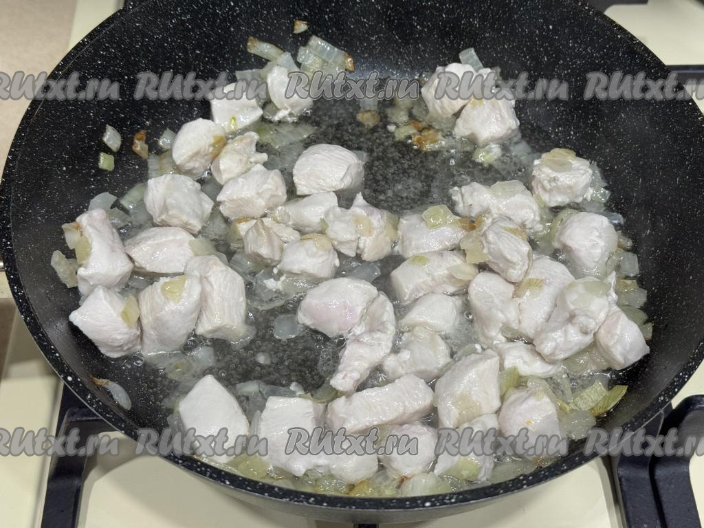 Обжарить лук на среднем огне до прозрачности (в течение 3-4 минут), иногда помешивая. После того как лук станет прозрачным, добавить к нему куриное мясо, нарезанное на средние кусочки, перемешать.