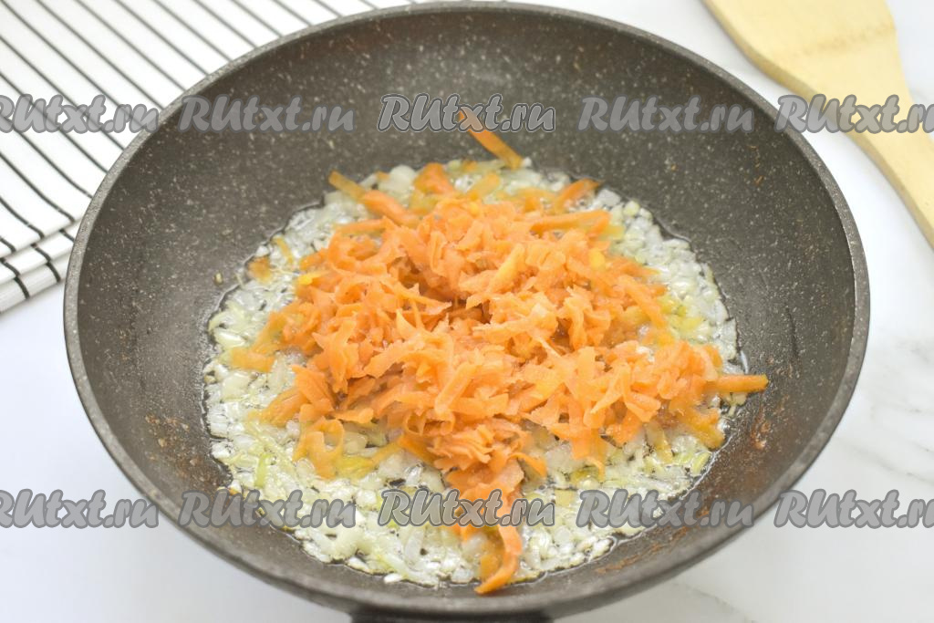 К обжаренному луку выкладываем очищенную морковку, натёртую на крупной тёрке, перемешиваем овощи и обжариваем их 5-6 минут (до мягкости моркови), не забывая иногда помешивать.