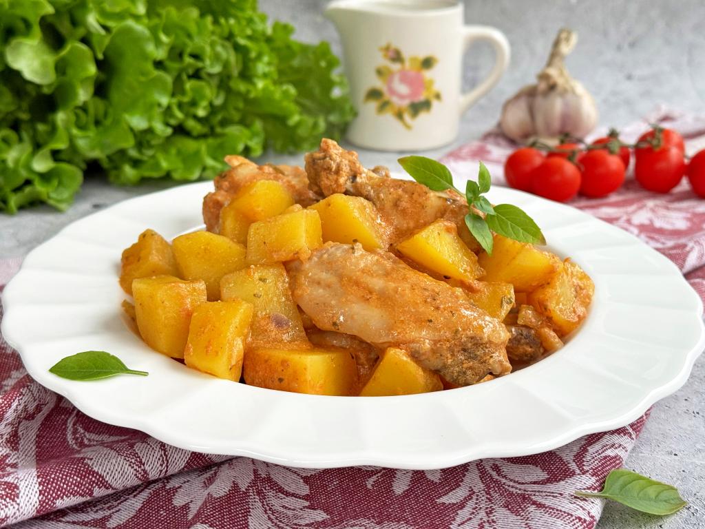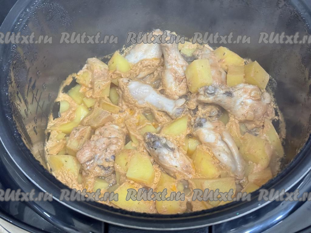 Мягкую, нежную тушёную картошку вместе с сочными, хорошо пропаренными куриными крылышками разложить из чаши мультиварки по тарелкам и подать аппетитное, вкусное, сытное блюдо к столу.