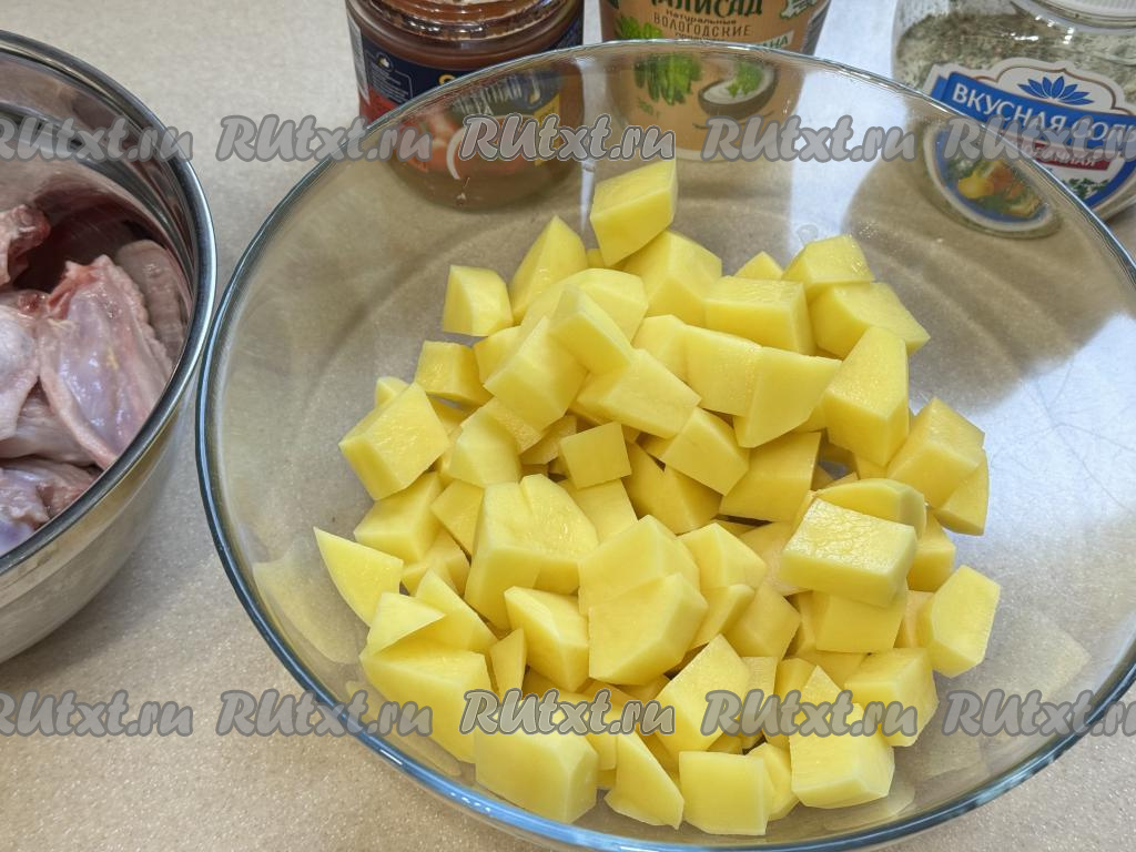 Подготовить продукты. Куриные крылья промыть водой, немного обсушить. Картошку и чеснок почистить.