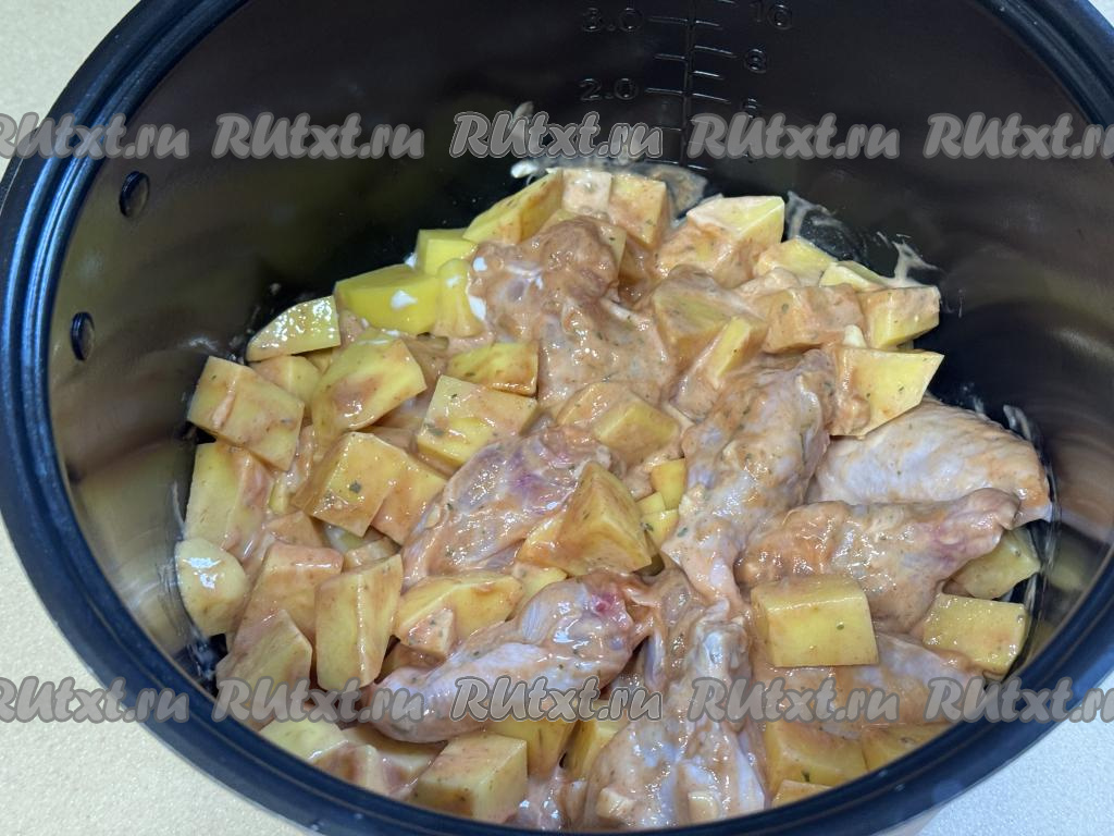 Чашу мультиварки немного смазать растительным маслом. Выложить картошку с куриными крылышками в чашу мультиварки, крышку закрыть. Выставить режим "Тушение" на 1 час.