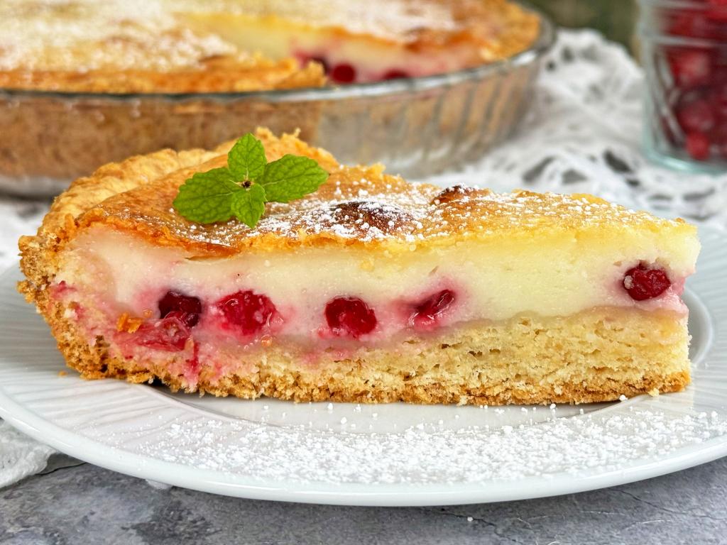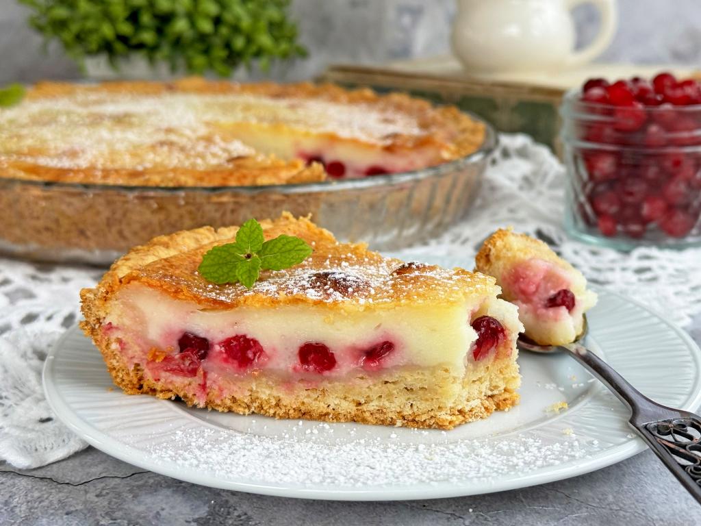 А вот как выглядит кусочек пирога в разрезе. Сочетание нежной сметанной заливки, кисленьких ягод клюквы и песочного теста делает эту выпечку очень вкусной!