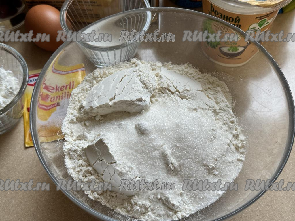 Первым делом приготовим песочное тесто. Для этого в миску нужно всыпать муку, разрыхлитель и сахар.