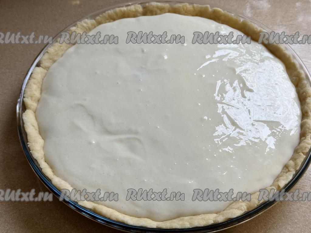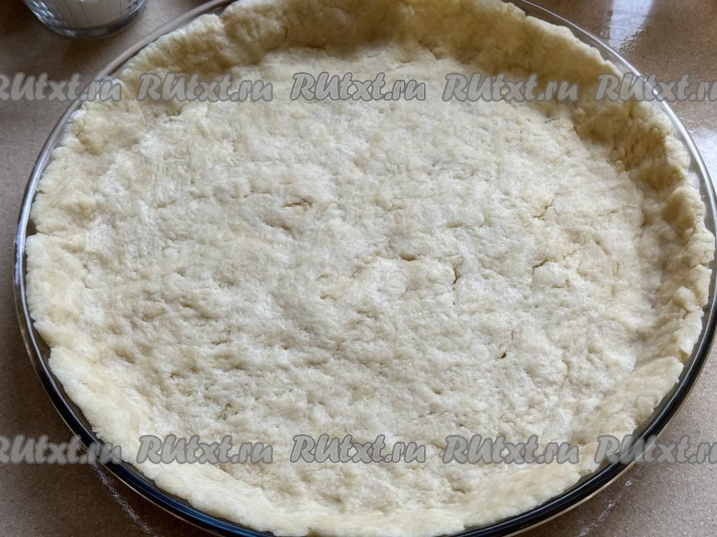 Выложить тесто в круглую форму для выпечки. Равномерно распределить тесто по дну форму, сформировать бортики. У меня была достаточно большая форма диаметром 26 сантиметров, поэтому я сформировала невысокий бортик.