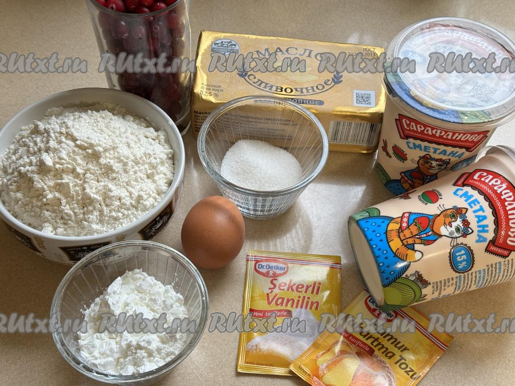 Подготовить продукты. Сметану нужно брать жирностью 15-20% (я использовала жирностью 15%). Клюкву можно взять как свежую, так и замороженную. Замороженные ягоды, если на них немного наледи, можно не размораживать. Свежую клюкву нужно будет промыть водой, а затем обсушить, разложив на бумажном полотенце. Крахмал подойдёт и кукурузный, и картофельный.