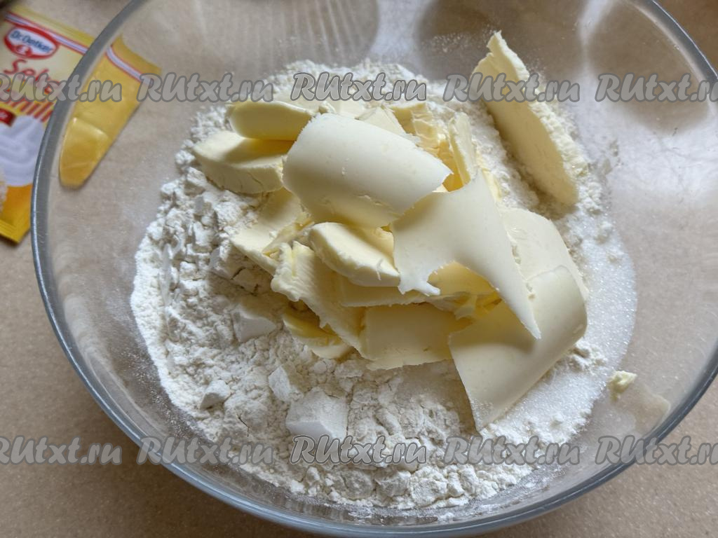 Сливочное масло достать из холодильника, сразу нарезать его на небольшие кусочки и добавить в миску с мукой.