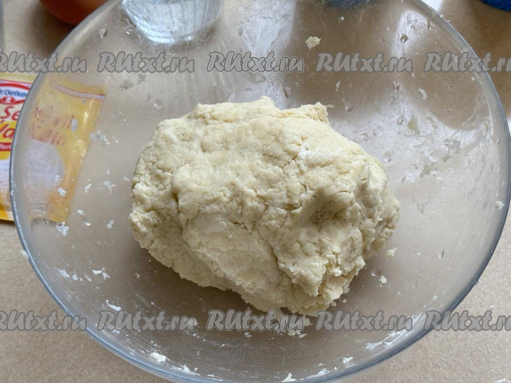 Замесить руками мягкое и пластичное песочное тесто, которое практически не липнет к рукам. Если тесто будет рассыпаться и не собирается в ком, тогда добавьте 0,5-1 столовую ложку холодной воды и вмешайте её, собирая тесто в ком. Песочное тесто не нужно долго вымешивать, достаточно, чтобы оно собралось в ком.
