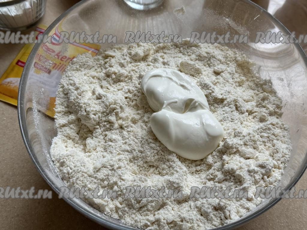 Перетереть содержимое миски руками до получения мелкой, однородной песочной крошки. Затем добавить сметану.