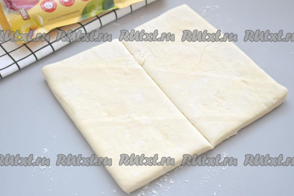Стол немного посыпаем мукой. Выкладываем на стол размороженную пластину слоёного теста. Раскатывать тесто не нужно. Разрезаем тесто на 2 половинки.