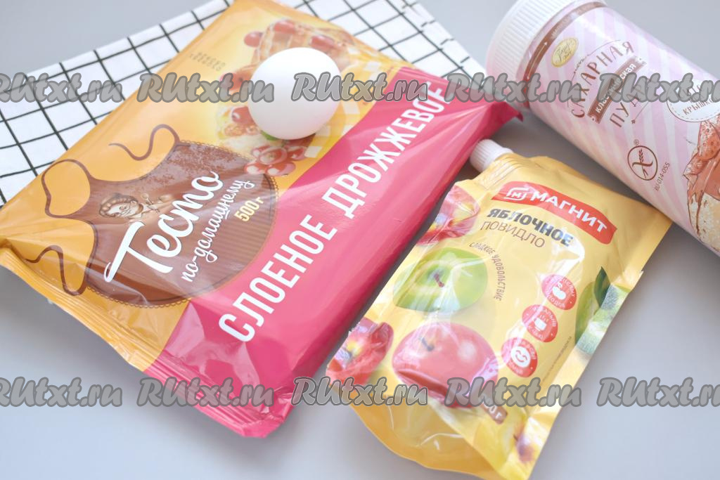 Прежде всего достаём из морозилки слоёное дрожжевое тесто и оставляем его размораживаться при комнатной температуре (обычно на размораживание требуется минут 30). Повидло для приготовления этих круассанов обязательно берите густое (у меня - покупное яблочное повидло).