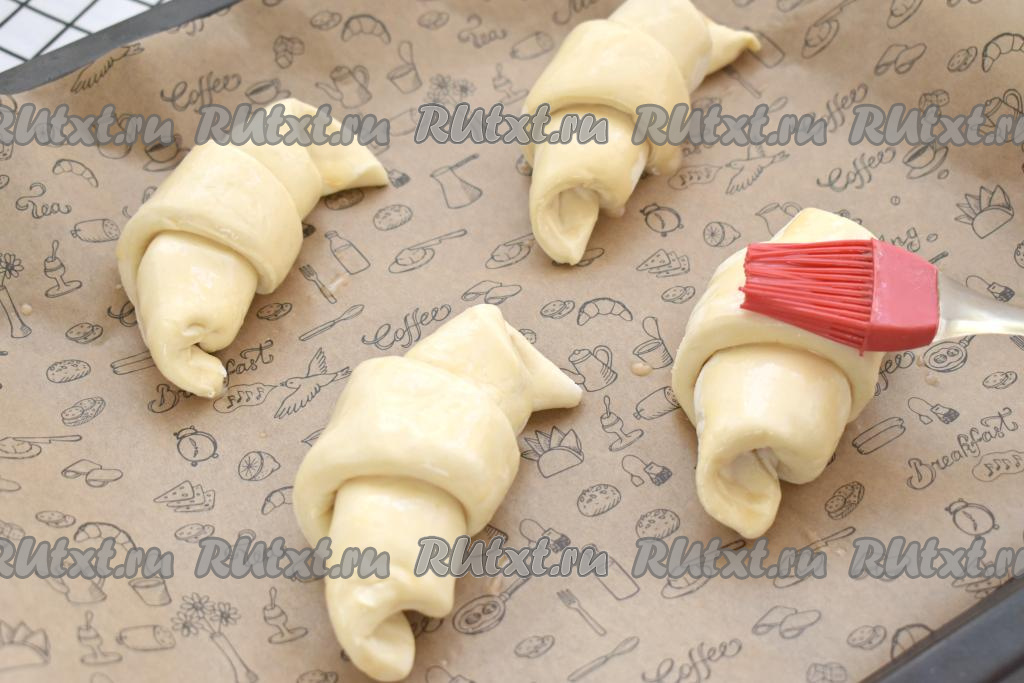 Круассаны на небольшом расстоянии друг от друга (круассаны увеличиваются в процессе выпечки) выкладываем на противень, застеленный бумагой для выпечки. Оставляем круассаны на 20 минут при комнатной температуре, чтобы слоёное дрожжевое тесто немного подошло. Затем в кружке взбиваем сырое яйцо и смазываем им круассаны.